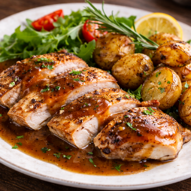 Stekt kyckling serveras med rostad potatis och skysås
