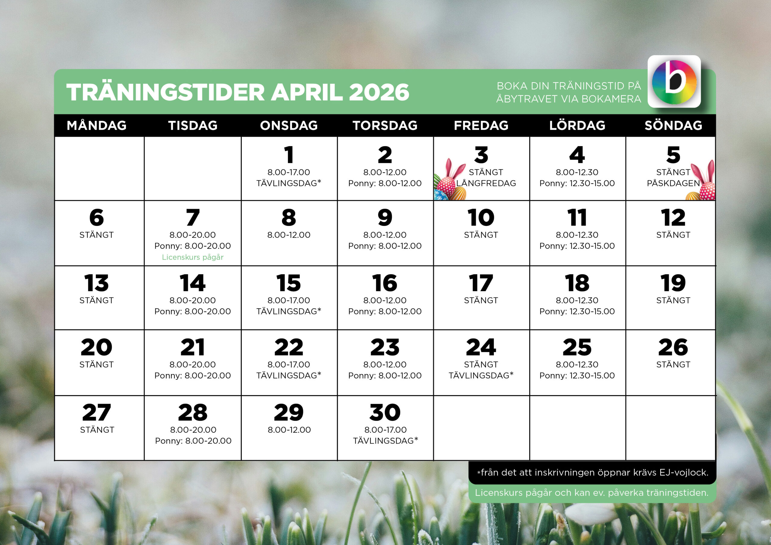 Gemensam träningstid: Även öppet för ponnys tisdagar jämna veckor kl. 08.00-20.00 och ojämna veckor kl. 08.00-18.30, samt torsdagar kl. 08.00-12.00. Om det är tävlingsdag en torsdag är det öppet för ponny kl. 08.00-15.00.