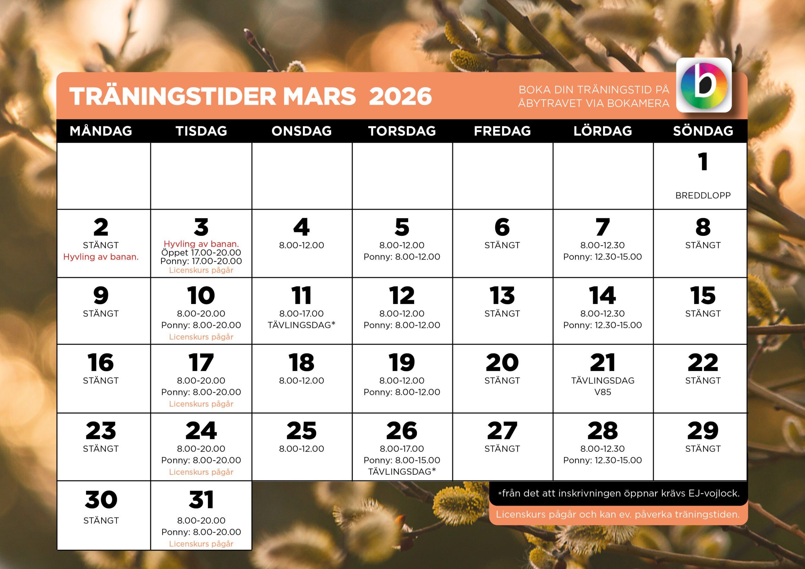 Licenskurs pågår enligt datumen i kalendern. Körning på banan beräknas tisdagar mellan 17.45-18.45 och lördagar mellan 10.15-10.45.