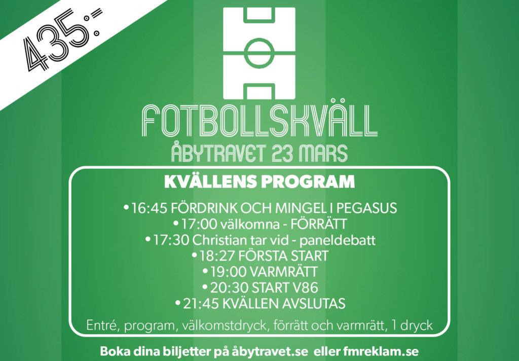Onsdagen den 23 mars tar Christian Olsson med Robert Laul som sidekick plats på scen och grillar Göteborgsklubbarnas representanter inför den Allsvenska säsongen. Och lita på att han laddat frågebatteriet lite extra till detta år. IFK Göteborgs Mikael Stahre & Per-Mathias Högmo från Häcken berättar allt som finns att veta om form, taktik och mål inför säsongen 2022. Utöver fotbollssnack och tävlingar mellan borden äter och dricker vi gott i Restaurang Pegasus. Givetvis tar vi också del av senaste nytt från stallbacken för att ringa in alla rätt på kvällens kupong.