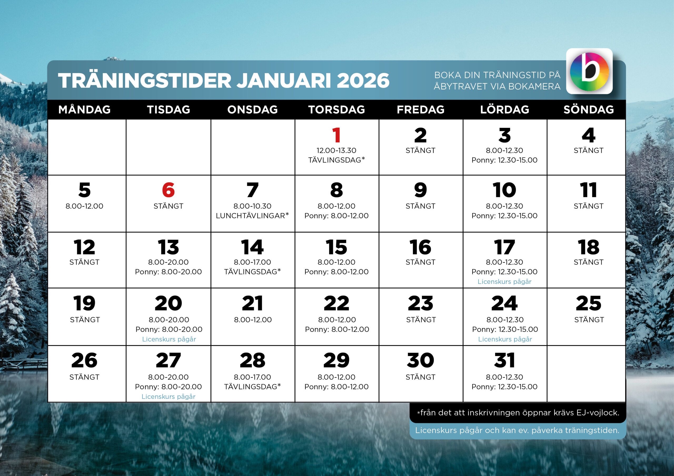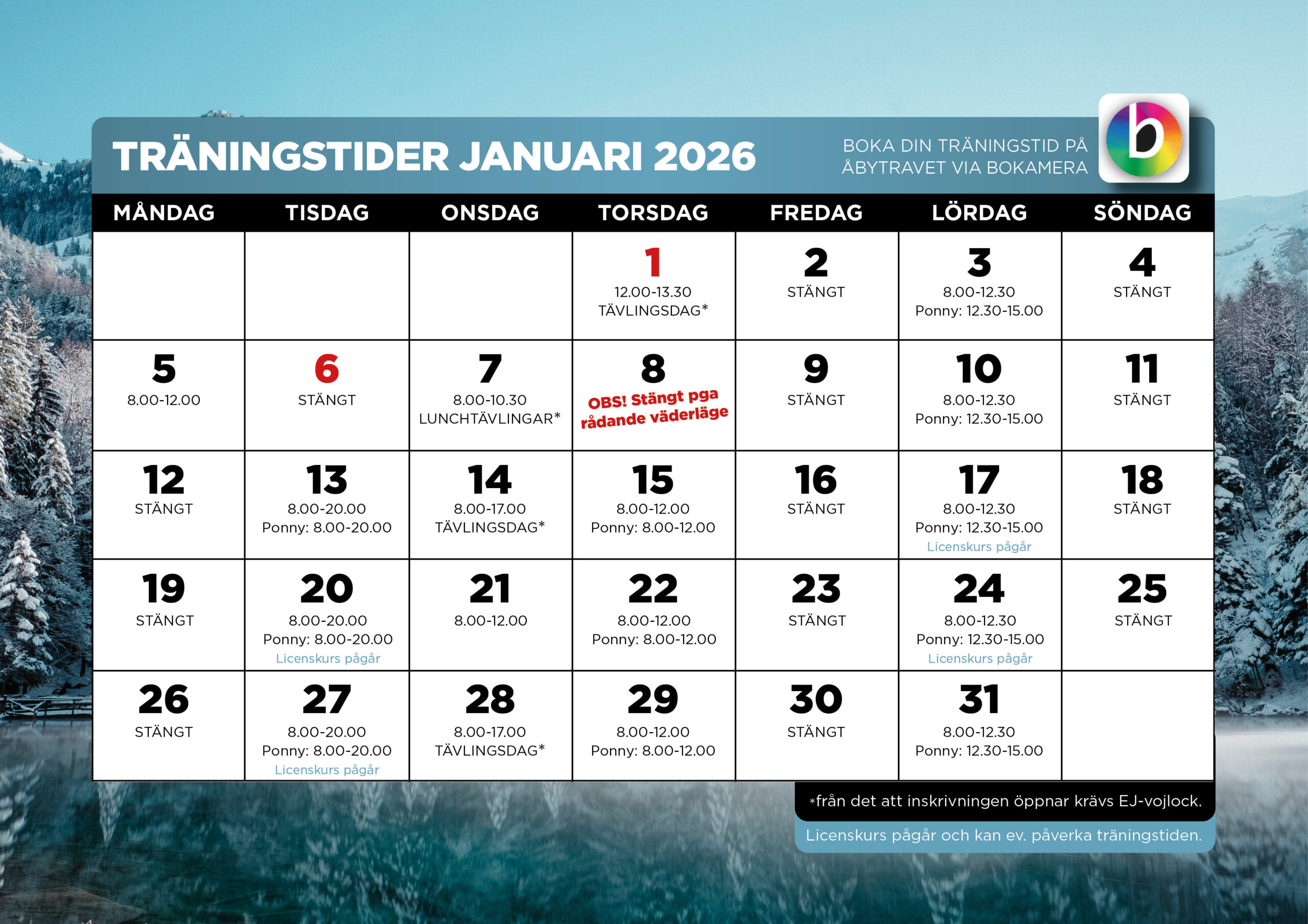 (Under de ojämna veckorna som det ej körs provlopp för storhästar på tisdagskvällar, är ponnys välkomna att träna till kl.20.00.) För jul-och nyårshelgen se kalendern ovan.