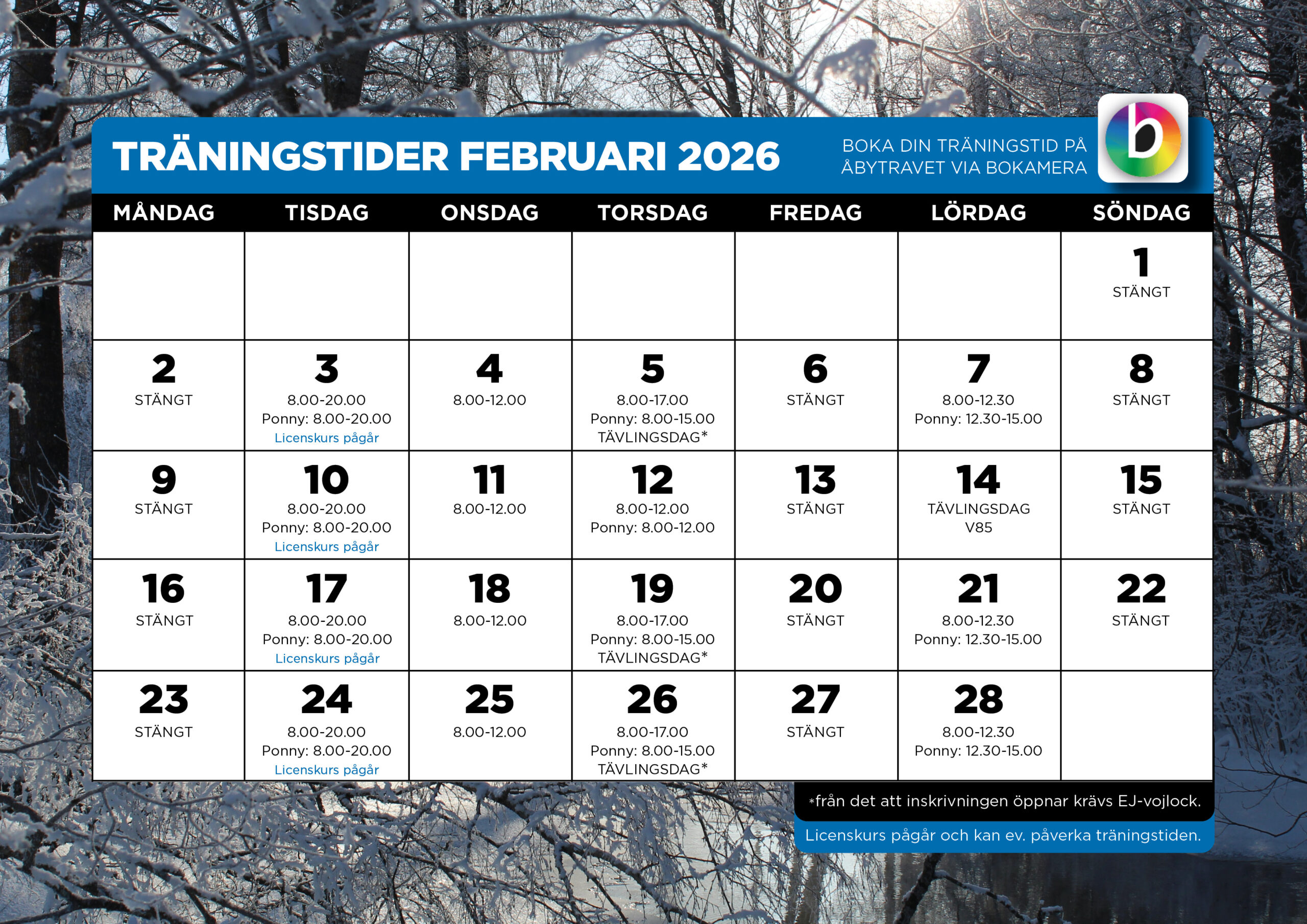 (Under de ojämna veckorna som det ej körs provlopp för storhästar på tisdagskvällar, är ponnys välkomna att träna till kl.20.00.) För jul-och nyårshelgen se kalendern ovan.